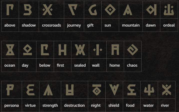 Each glyph was authored with intent. Some carried broad philosophical meaning, while others were designed to map directly to narrative beats, quests, or environmental mechanics within Brimstone Sands. The result was a symbolic language that functioned both as lore and as a gameplay key.