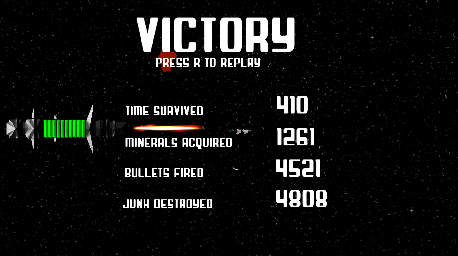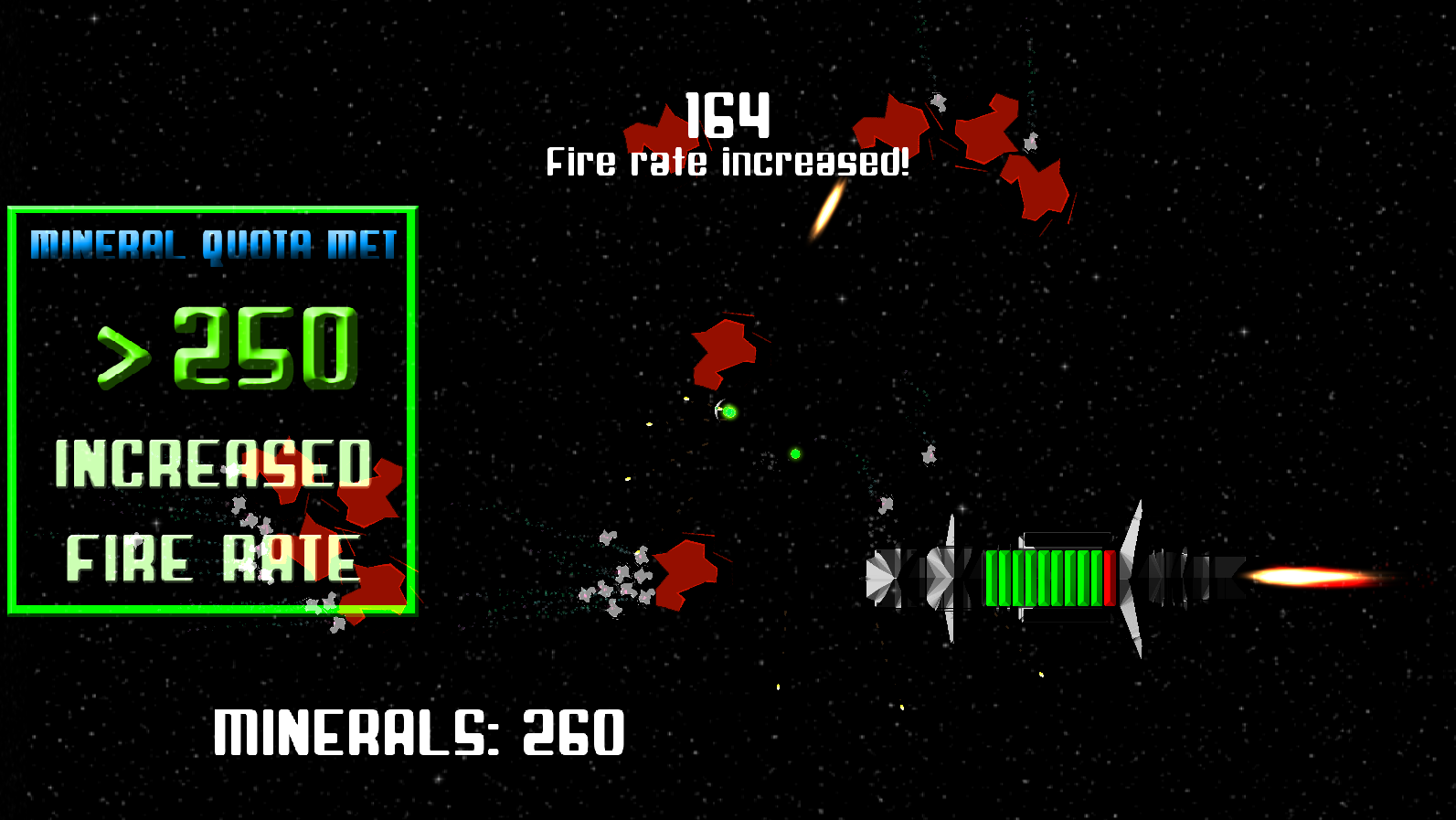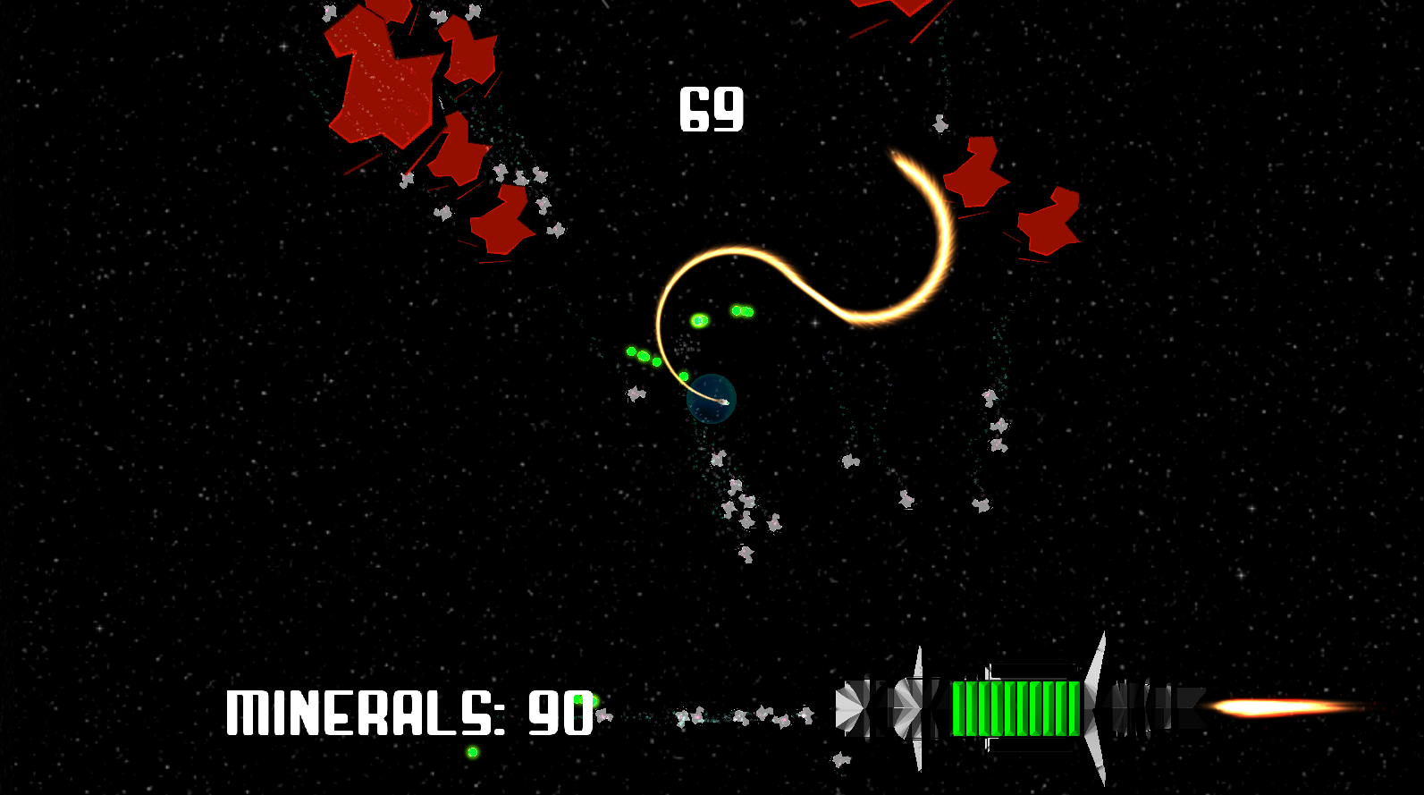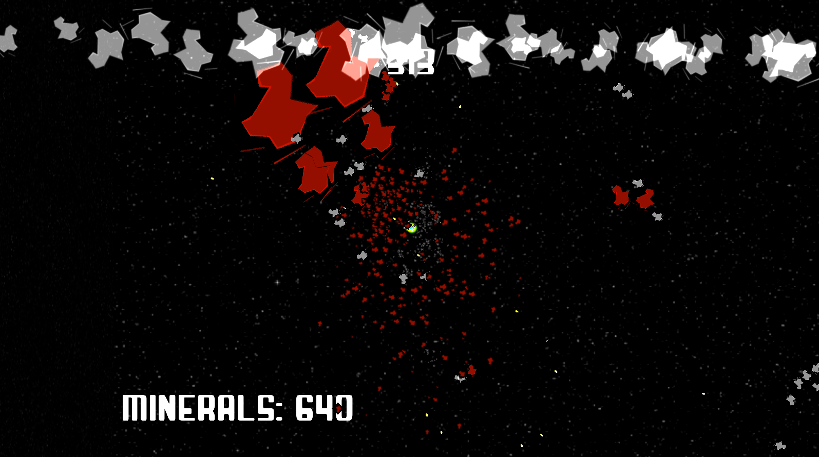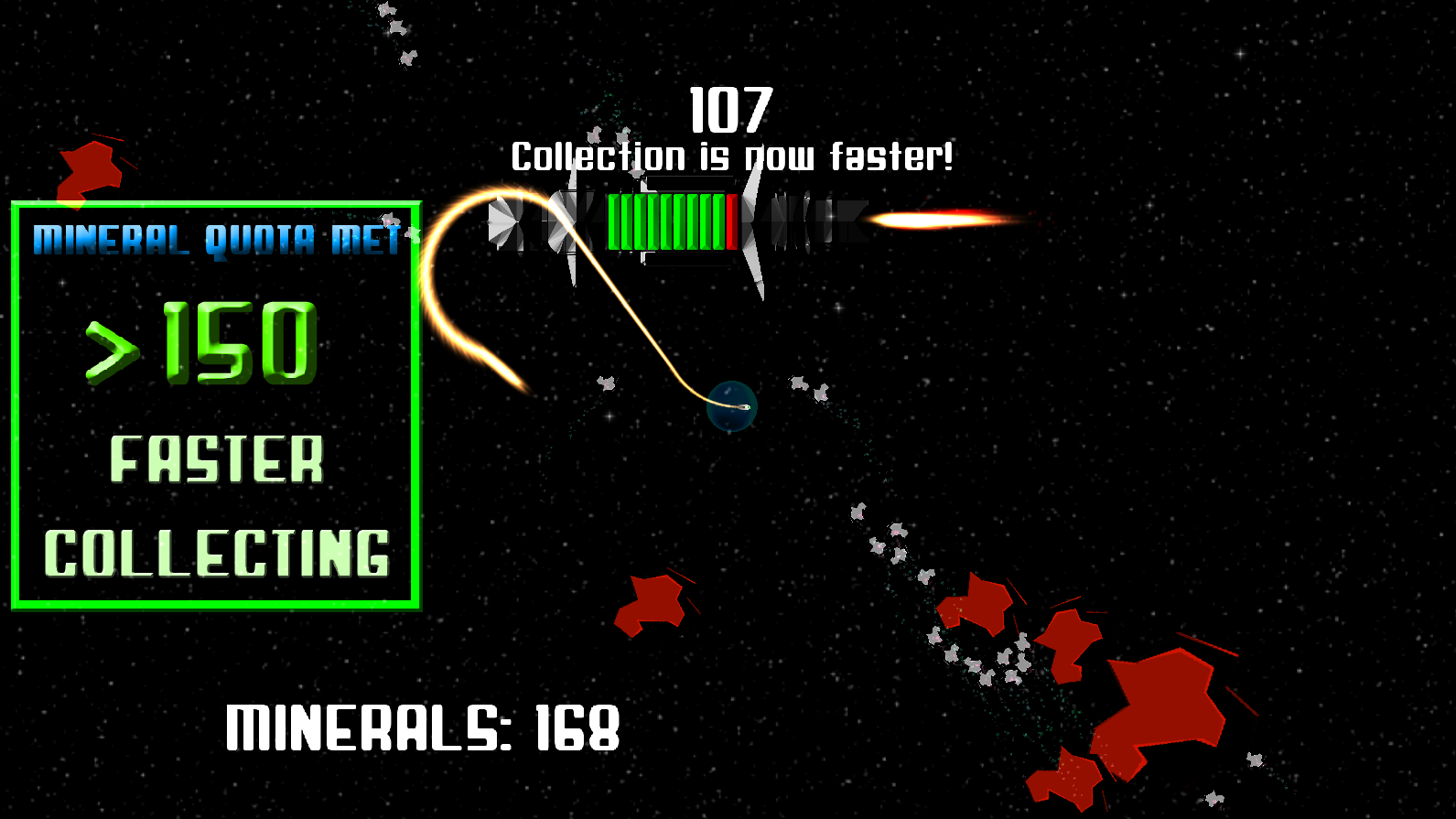 Asteroids appear through a wave-based system, and the ship’s health regenerates with each collected mineral that the player feeds into it. As the base ship’s health decreases, the speed of the asteroids decreases as well.